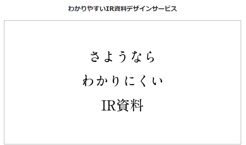 単なるデザイン代行ではなく、IR資料のストーリー立案からフォーマット作成、図解など、幅広い課題をデザイン面で解決することを特徴としています。