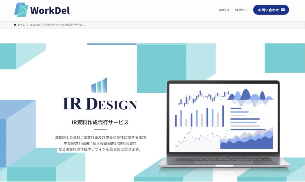 株式会社ワークデルが運営する「IR Design」は、IR資料の作成やデザインを総合的に請け負う代行サービスです。