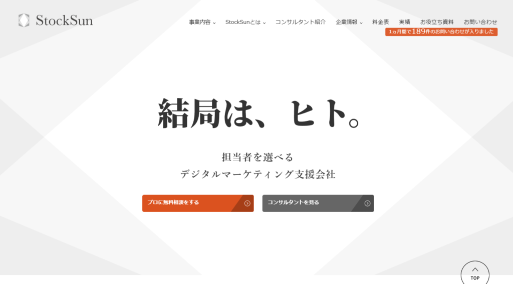 「StockSun株式会社」は、各分野の実力派フリーランスが集結した日本最大級のマーケティング集団です。StockSun株式会社が提供する「伴走LP」は、マーケティングのプロが勝てる勝ち筋を設計しCVRの高い「爆上げLP」を制作することに特化したサービスです。プロのマーケターが過去5,000件以上のテスト結果に基づき、初動から高いCVR(成約率)を叩き出すための戦略を設計するのが特徴です。