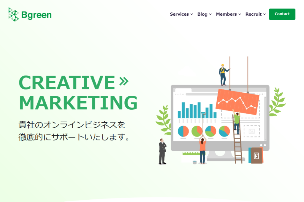 「株式会社Bgreen(ビーグリーン)」は、13年のLP制作の歴史を持つ、経験豊富な制作会社です 。最安3.3万円(税込)からという圧倒的な低価格を提供しており、テンプレート使用からフルパッケージまで4つのプランが用意されています。