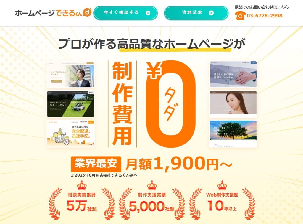 「ホームページできるくん」は、初期費用0円、月額1,900円からという驚異的な低コストでLP制作を始められる、サブスク型のホームページ制作サービスです。制作費用が無料になるキャンペーンを活用すれば、初期投資を大きく抑えられるため、予算が限られている企業や、まずはスピーディーに公開したい企業におすすめのサービスと言えます。